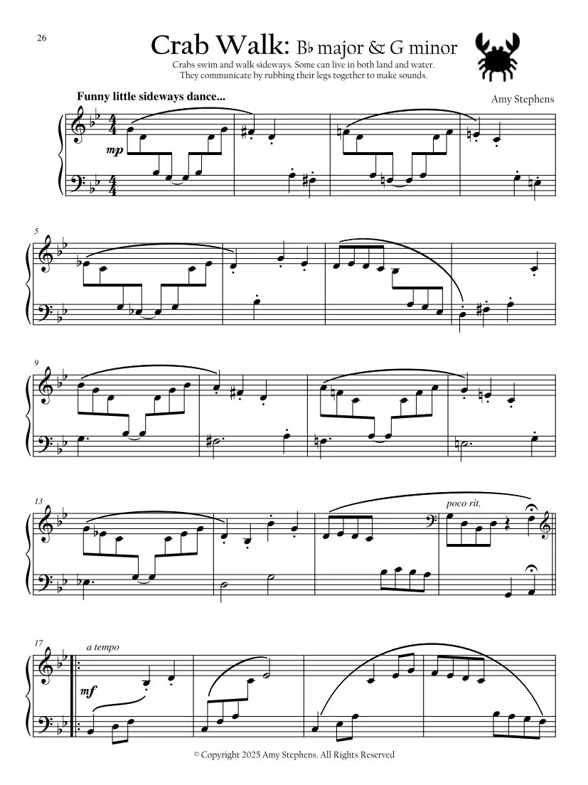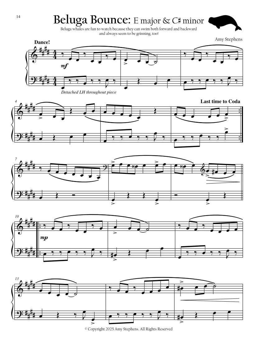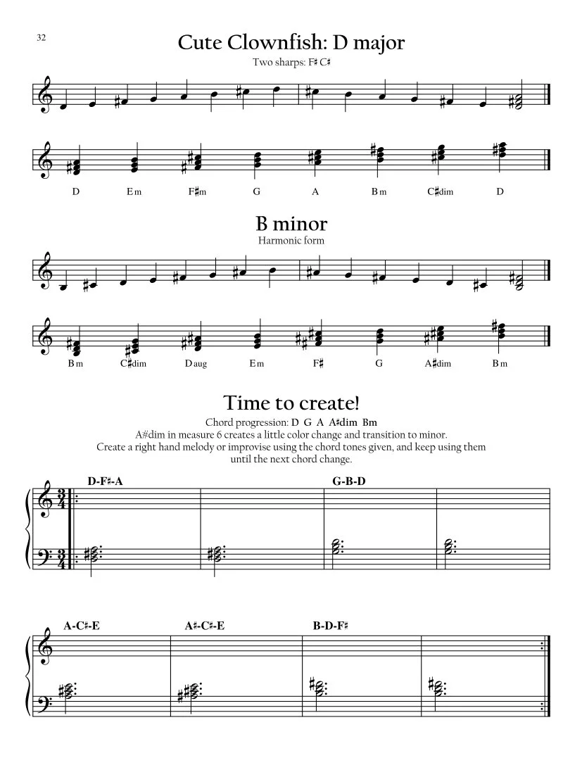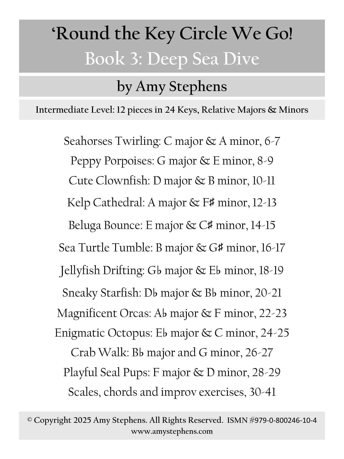Pieces represent each key in the circle of 5ths: each piece modulates between major and its relative minor. Also included are scales and chords for each major and minor key and 8-measure improvisation/composition prompts.